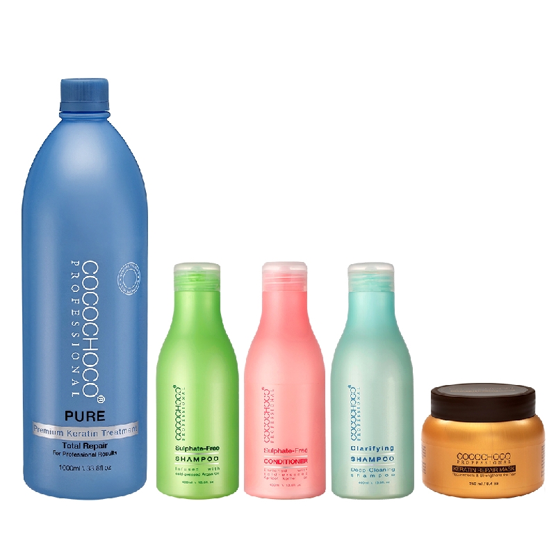 COCOCHOCO Pure Brazilian Keratin Treatment Set No. 41 The set includes: Cocochoco Keratin PURE 1000ml + Cocochoco care shampoo 400ml + Cocochoco conditioner 400ml + Cocochoco clarifying shampoo (for the treatment) 400ml + Cocochoco keratin mask 500ml Cocochoco Keratin 50ml - manufacturer's jar. Exceptional formula enriched with cocoa bean extract. Stimulates proper hair growth and gives them more volume. Action: • Exceptional shine and softness for a longer time • Regenerates very damaged hair • For light hair Cocochoco Keratin 50ml - manufacturer's jar. Exceptional formula enriched with cocoa bean extract. Stimulates proper hair growth and gives them more volume. Action: • Exceptional shine and softness for a longer time • Regenerates very damaged hair • For light hair USE METHOD: 2. Dry the hair with a blow dryer on medium heat until completely dry. 3. Comb the hair thoroughly (in the case of damaged hair, do not comb it forcefully). Divide the hair into 4 sections. 4. Shake the bottle well before use. Pour the desired amount of the product (50-100ml) into a bowl. 5. Apply keratin to the hair with a brush starting 1cm from the scalp. After applying the product to a strand, gently massage it with your hands—wear vinyl gloves to protect your hands. 6. After finishing the application, wait 30 minutes. After 30 minutes 7. Using a flat iron, straighten each strand 5-7 times. A professional flat iron for keratin hair straightening is recommended. Temperature: Healthy and natural hair 230°C. Sensitive hair 210°C at the roots – up to 180°C at the ends (if the ends of the hair can withstand the temperature, we can also straighten them at 210°C).